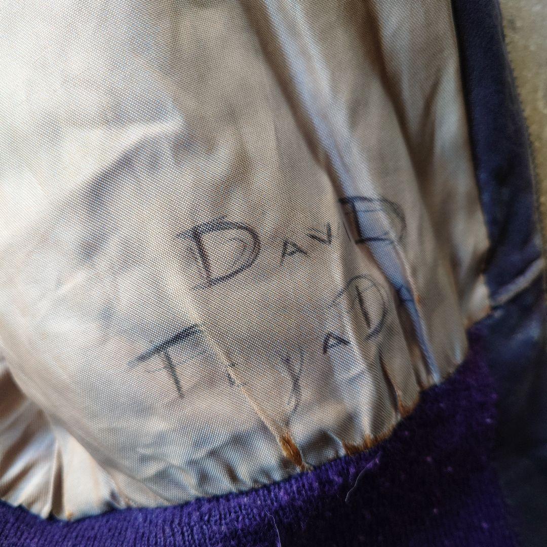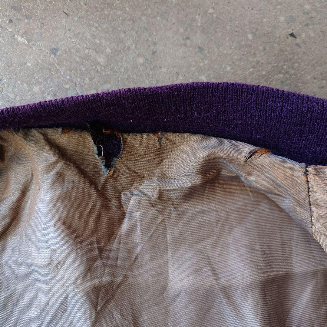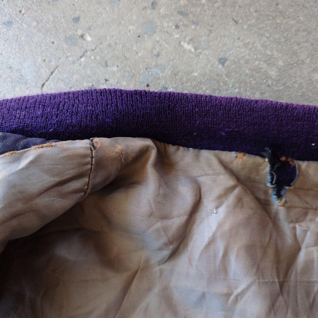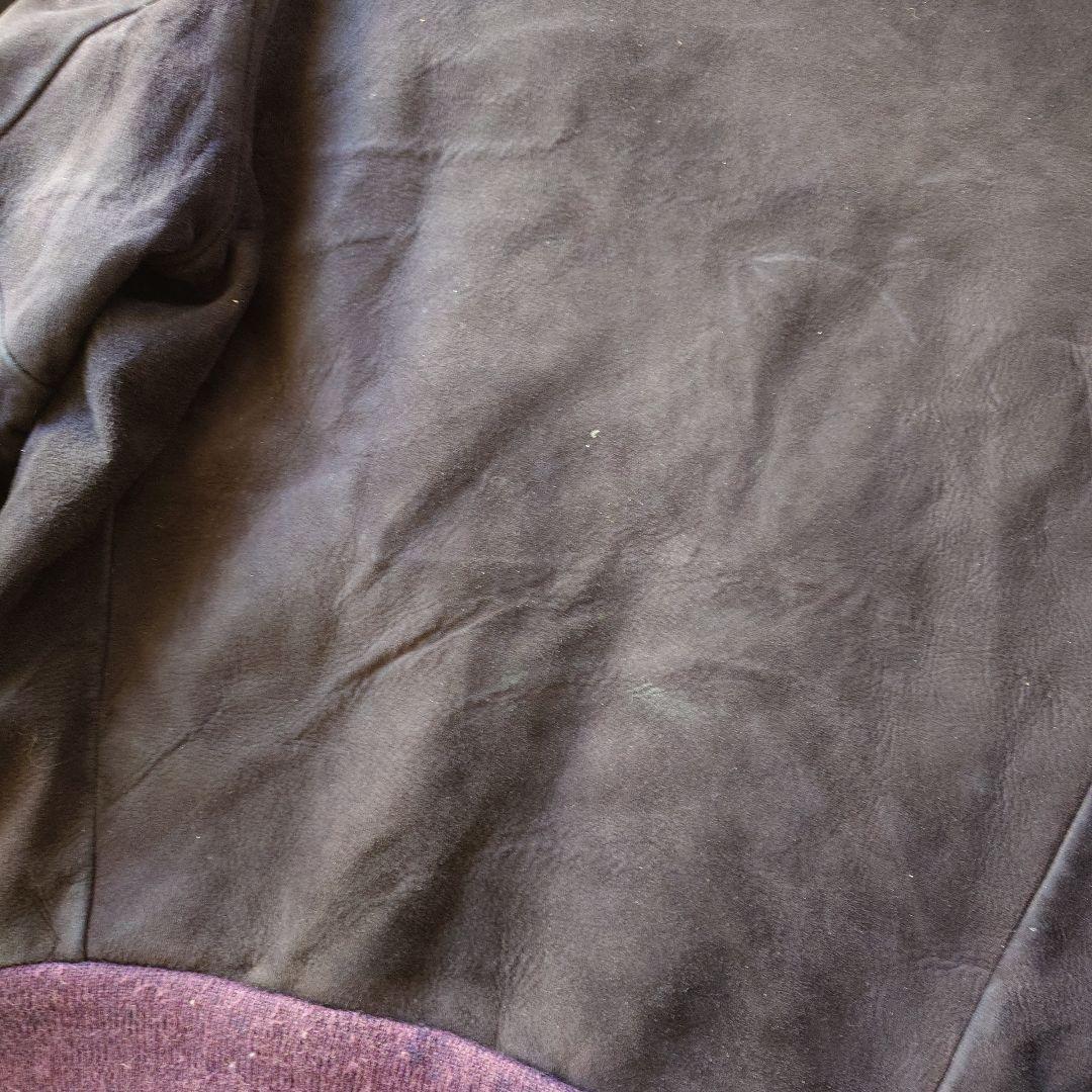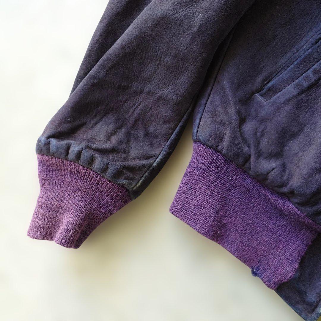 ■商品名ノーブランド ■色パープル ■サイズMからL ■肩幅 48 cm ■身幅50 cm脇下採寸 ■着丈 61 cm首下より採寸 ■袖丈 62 cm ■素材 レザーヌバック ●商品説明 ヴィンテージのレザーブルゾンになります ヌバックを使用しており 濃いめのナスコンのボディに紫のリブがとてもかっこいい配色です ブランド 不明ですが 50年代から60年代のものかと思われます 裏地の首回りがダメージがございます 表面は見頃の部分に少しダメージがあります とても古いものですがジップも可動し リブも状態が良く 希少な アイテムです
