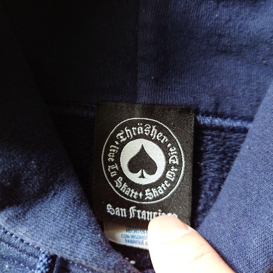 ■商品名THRASHER ■色ネイビー ■サイズM ■肩幅 53 cm ■身幅 53 cm脇下採寸 ■着丈 56 cm首下より採寸 ■袖丈 60cm ■素材 コットン ポリ ●商品説明 90年代スペードタグ スラッシャーのパーカーになります ネイビーに定番のロゴはとてもかっこいいデザインです 使用感 ございますが目立つ ダメージはございません