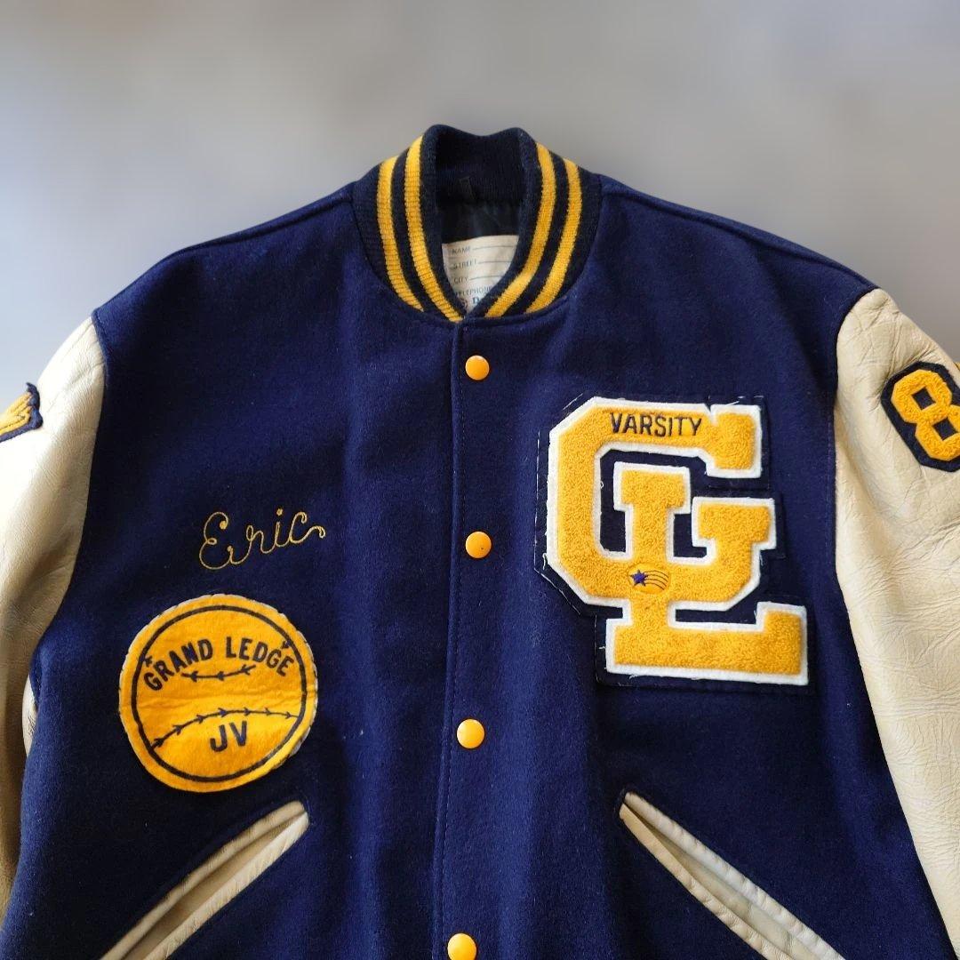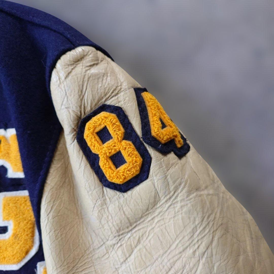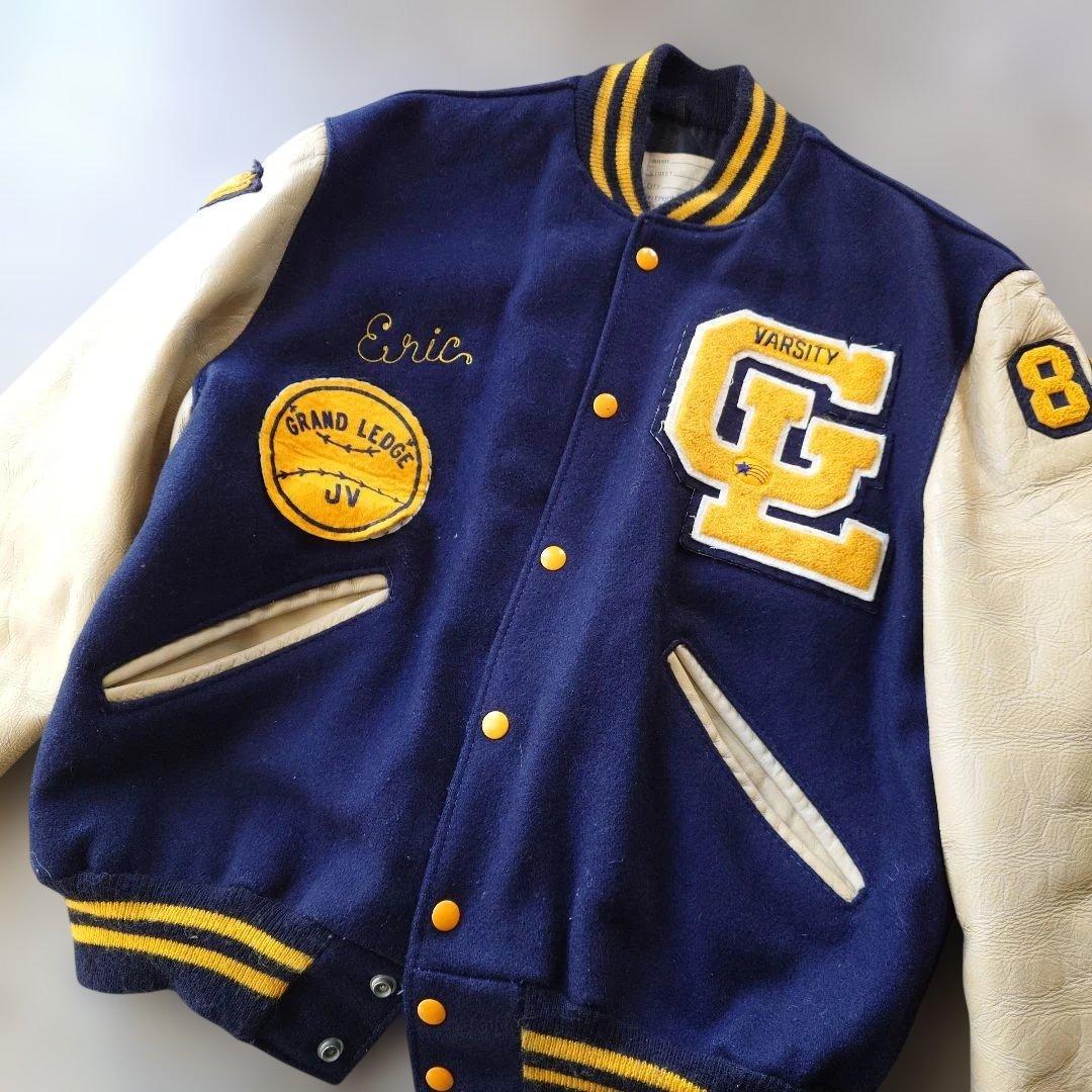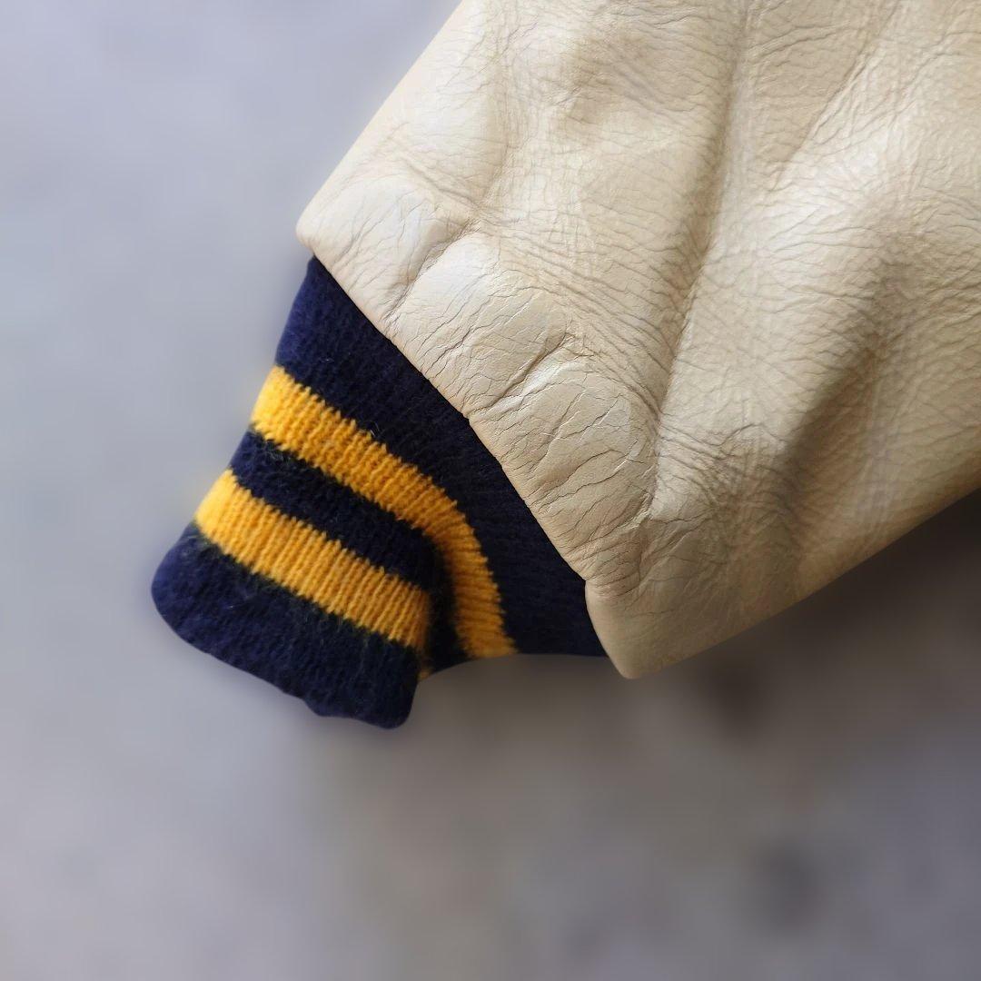 ■商品名delong ■色ネイビー ■サイズ42 ■肩幅 50 cm ■身幅 60cm脇下採寸 ■着丈 61 cm首下より採寸 ■袖丈 61 cm ■素材 ウール レザー ●商品説明 デロングのスタジャンになります アメリカの老舗 スタジアム メーカーでワッペン シニールのついた 良質なスタジャンを数多く排出してきております レザースリーブのスタジャンは近年数が少なく レザーが劣化してるものも多いですが こちらは ダメージもなく とても 状態がいい お品です ネイビーにクリームの人気のカラーリングでワッペン もとても 雰囲気があります
