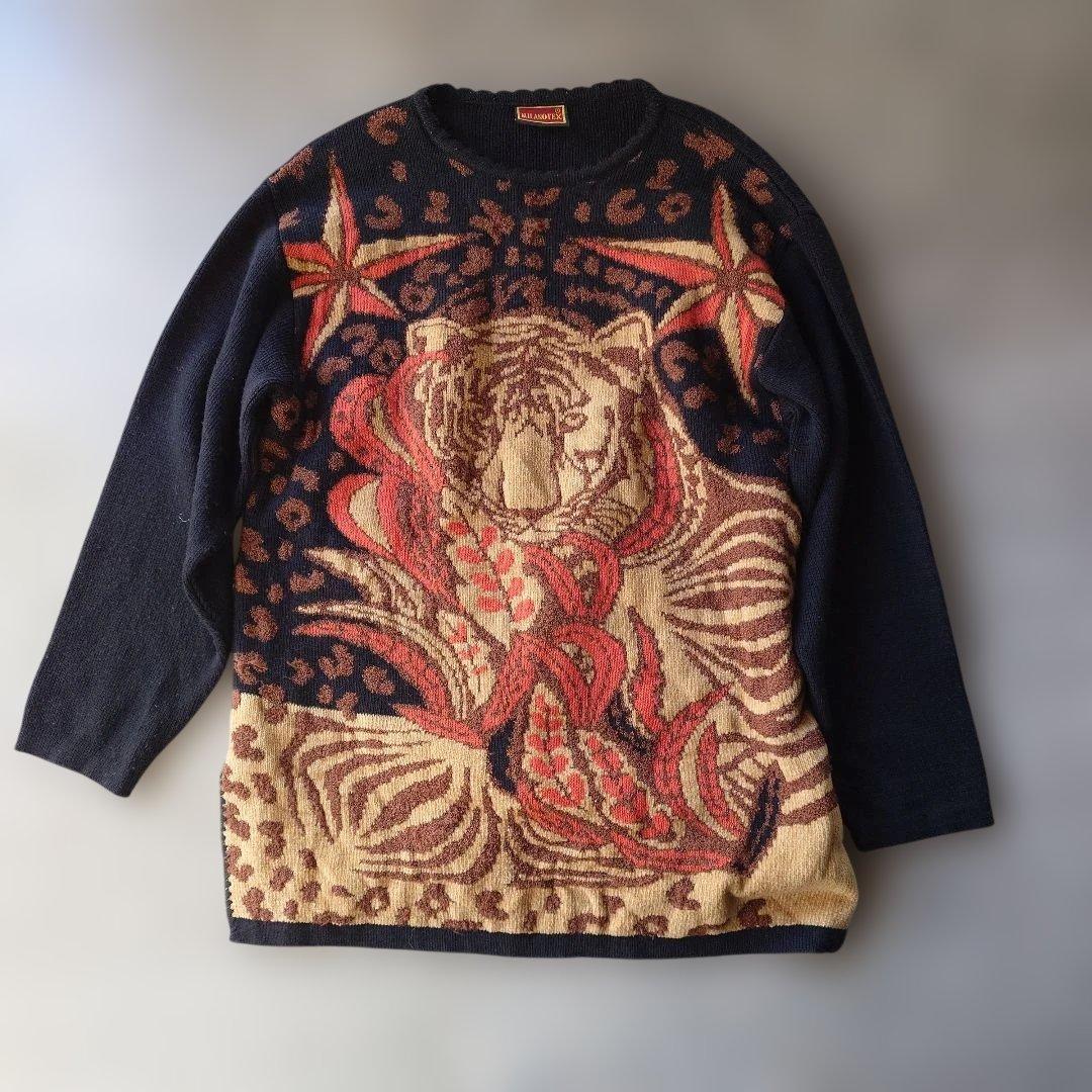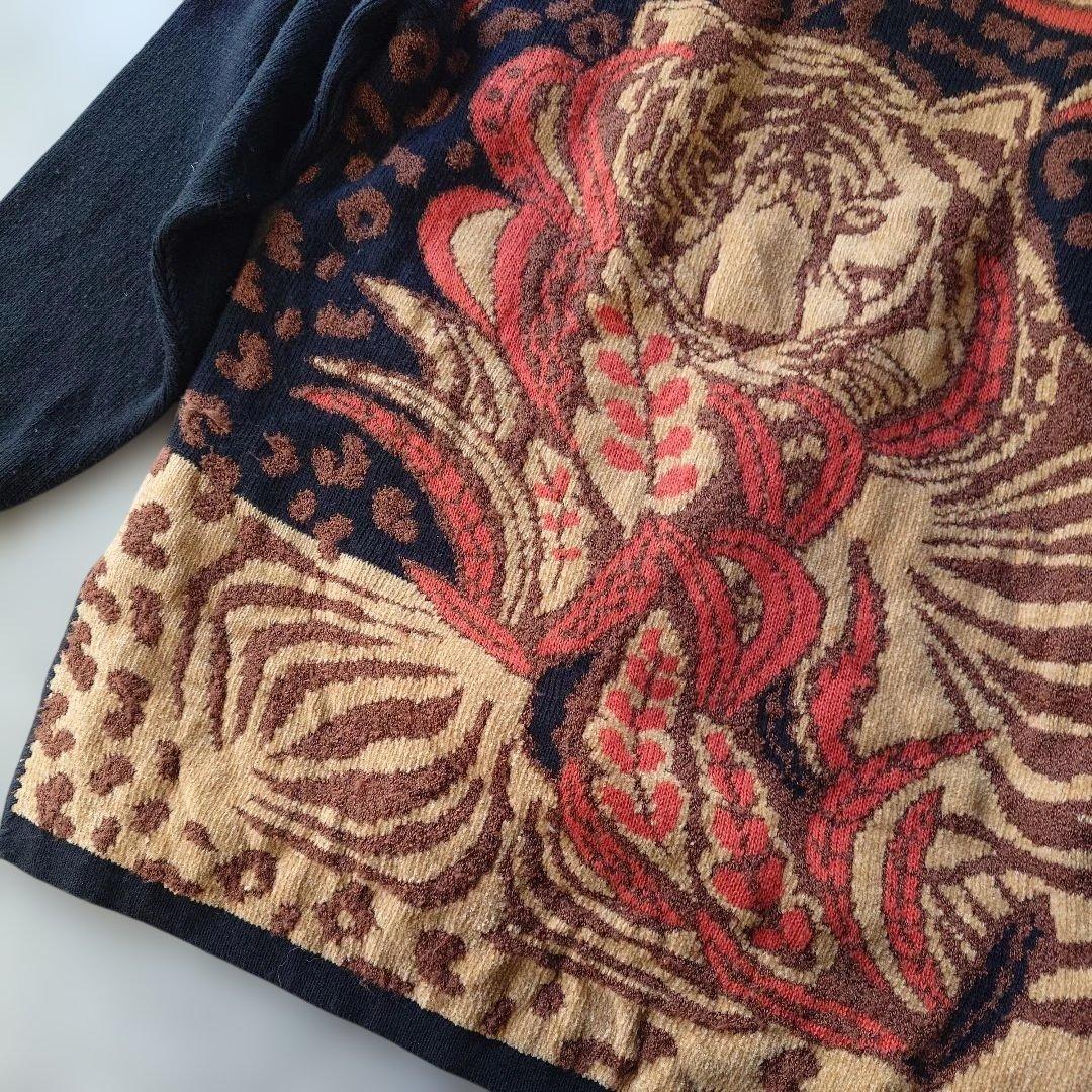 ■商品名ノーブランド ■色黒 ■サイズL ■肩幅 52 cm ■身幅 52 cm脇下採寸 ■着丈 71cm首下より採寸 ■袖丈 53 cm ■素材 ウール ●商品説明 古着のレディースのニットになります トラの柄がおられており とてもかっこいいデザインです ふわっと柔らかい ウールを使っており チクチクもしない生地感です。 着丈が長く サイドスリットでニットワンピーのように着ていただけます