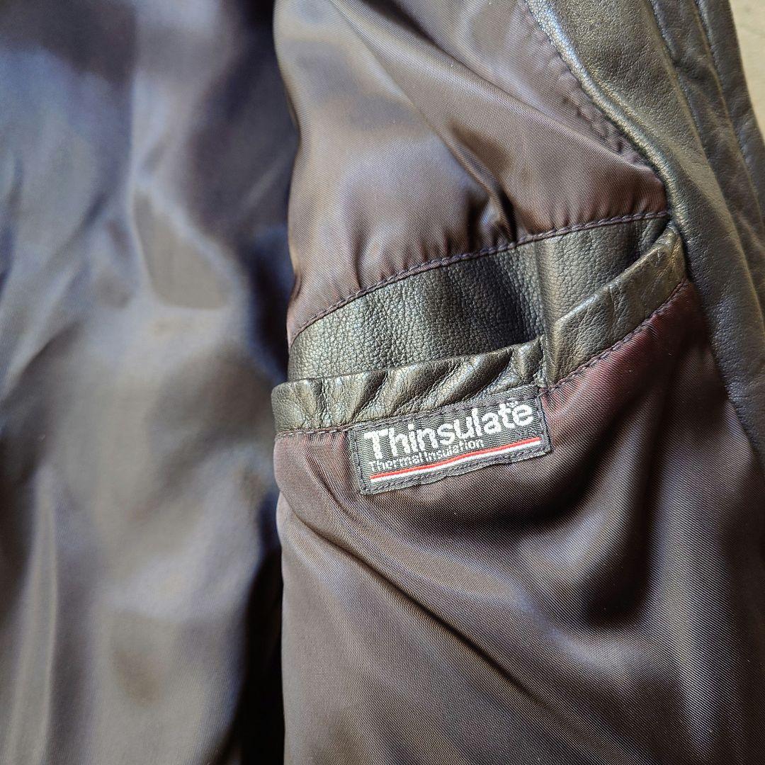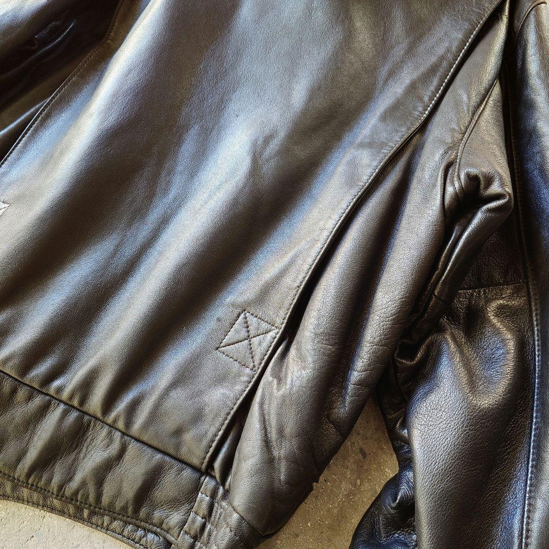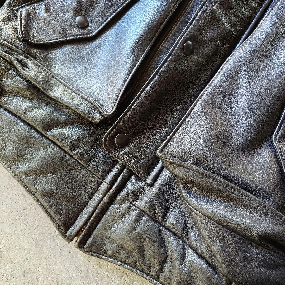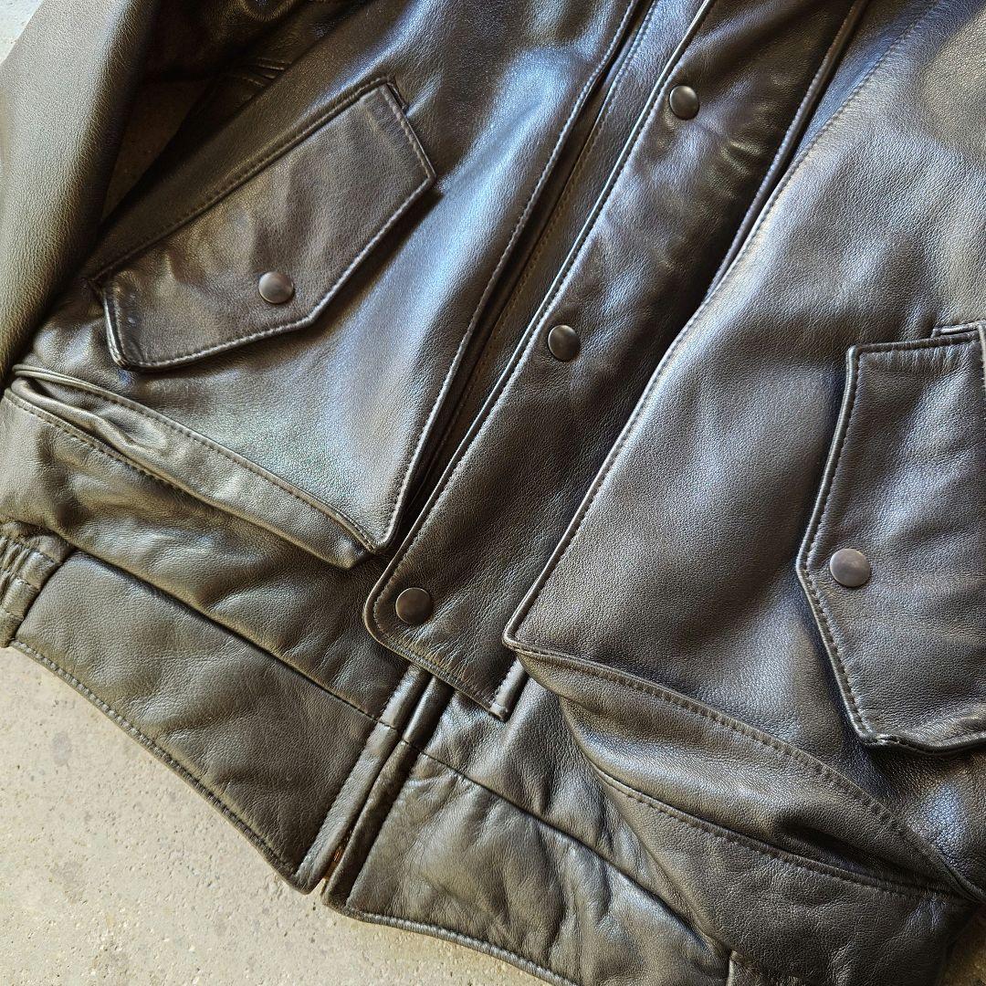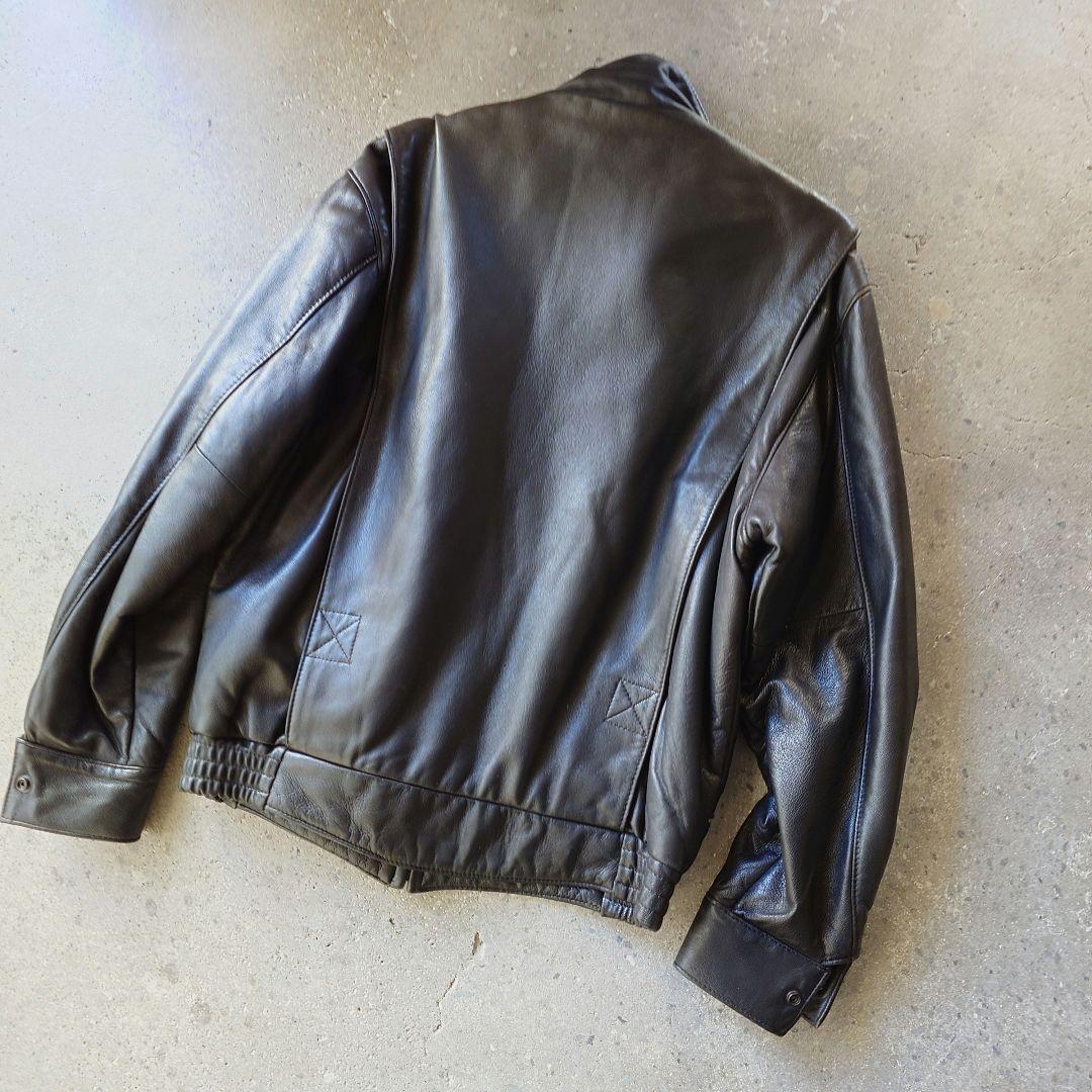 ■色ブラック ■サイズ38 ■肩幅49 cm ■身幅 52cm ■着丈 65cm ■袖丈60 cm ■素材 ラムレザー シンサレート ●商品説明 ゴールデンベアのレザージャケットになります スタジャン など レザーアイテムを製作している老舗のブランドになります 90年代のラムレザーでもちもちの質感でとても柔らかく質のいいレザーです。 フロント部分にも プリーツがついている珍しいデザインでレトロフューチャーな かっこいいデザインです 裏地には シンサレートの中綿が入り春先のブルゾンとして使いやすいアイテムです サイズsからm相当になります。