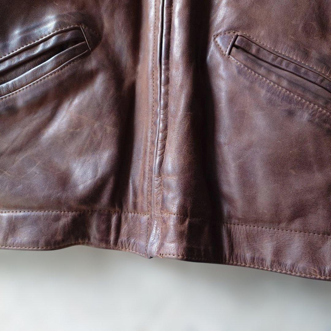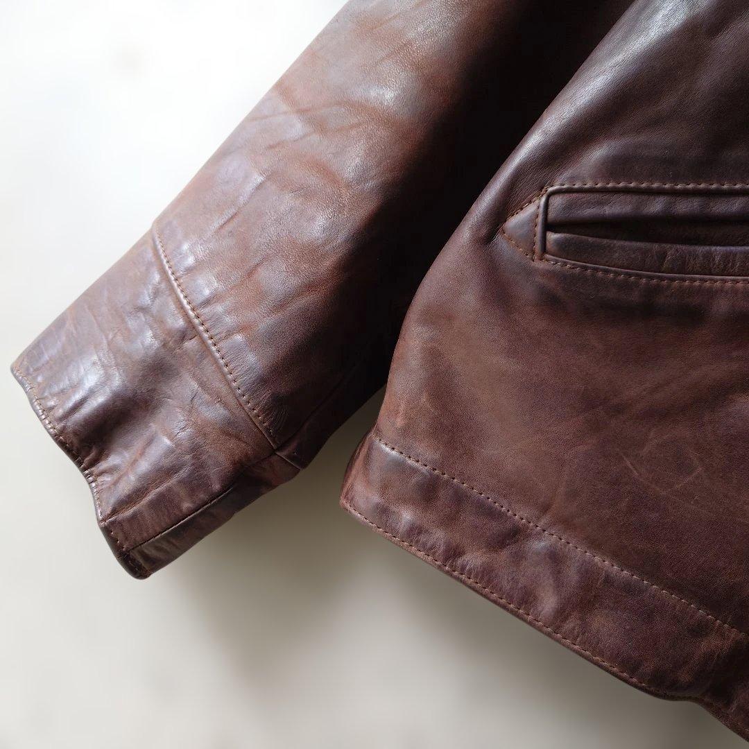 ■商品ユーズド レザー ■色ブラウン ■サイズL ■肩幅 48 cm ■身幅 56 cm脇下採寸 ■着丈 64cm首下より採寸 ■袖丈 62 cm ■素材 カウハイド ●商品説明 肉厚なカウハイドを使用しており もちっとした柔らかなブラウンのレザーがとても 雰囲気のいいレザージャケットです フライトのデザインですが トラッカージャケットのような形で丈が短く バランスよく着ていただけます 目立つ ダメージなどもございません