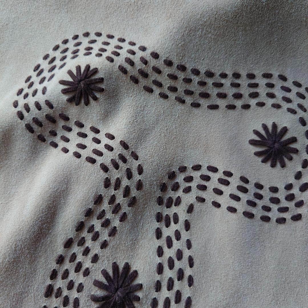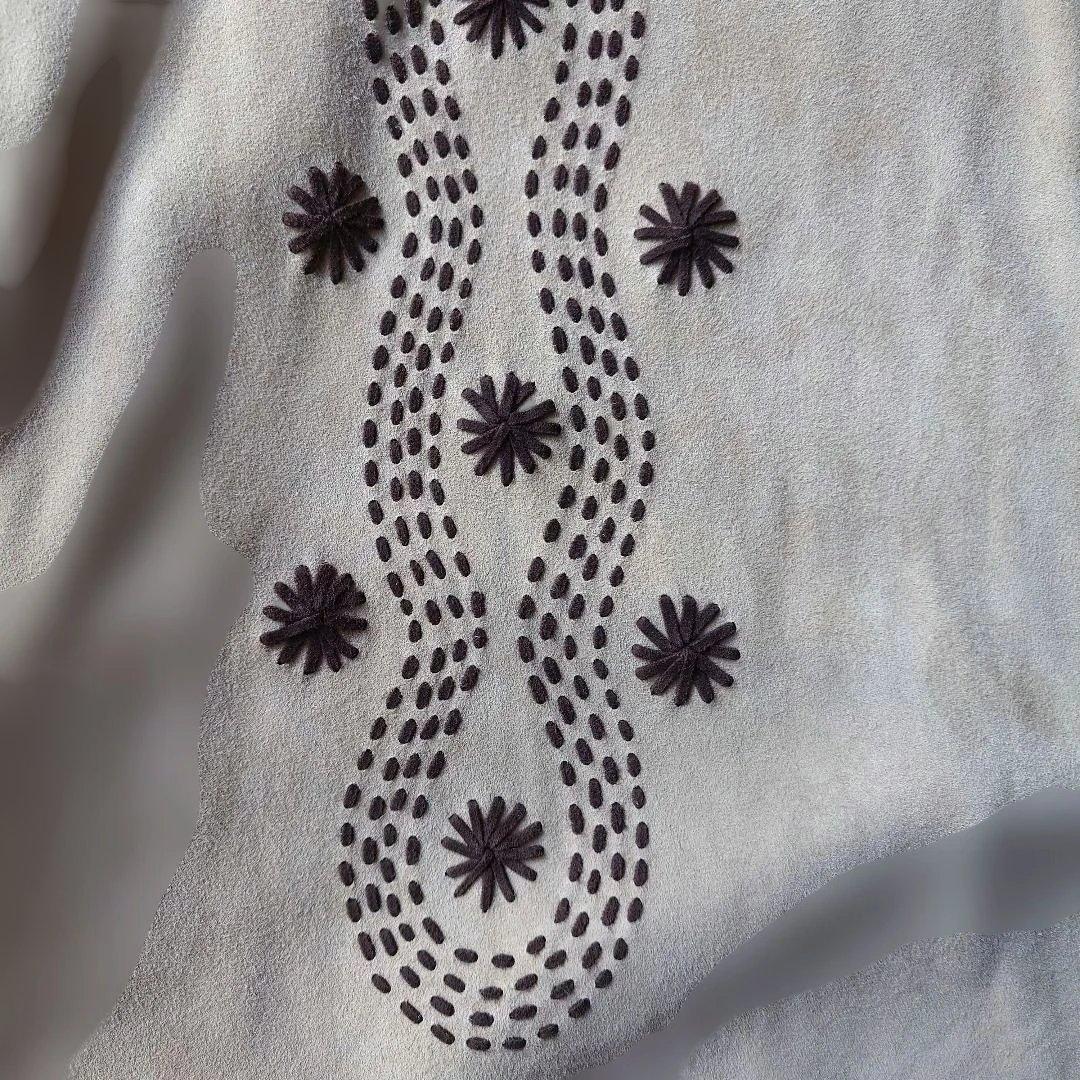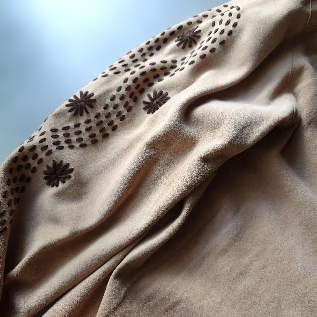 ■商品名KERRY GRIMA ■色ベージュ ■サイズM ■肩幅 50 cm ■身幅 53cm脇下採寸 ■着丈 79 cm首下より採寸 ■袖丈 71 cm ■素材 レザーラム スウェード ●商品説明 ハリウッドセレブにも人気のケリーグリマのスウェードシャツジャケットになります 上質でトロトロの とても 肌触りの良いレザーです。 1枚仕立ててシャツブルゾンのように着ていただけます 細身で着丈が長く サイズ M ですが 日本の L から XL 相当 ございます ハンドメイドで施されたレザーの柄はとてもかっこいい お品です フロントはスナップボタンで簡単に着脱できます。 サスティナブルなブランド でヒッピーでオーガニックな雰囲気 リゾートウェアです。