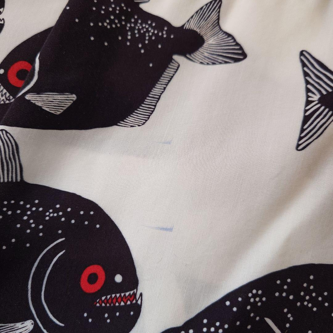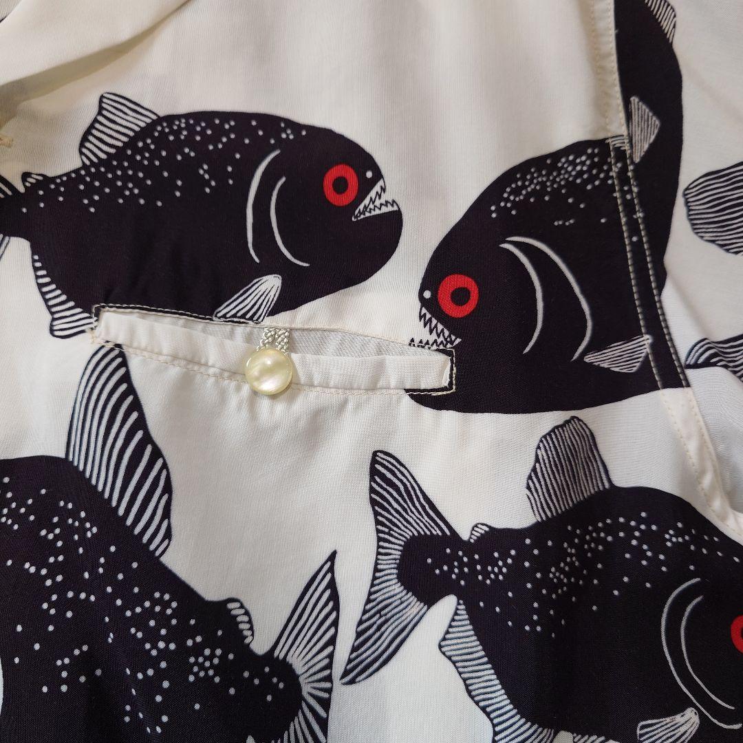 ■商品名スターオブハリウッド ■色白 ホワイト ■サイズ ■肩幅 46 cm ■身幅52 cm脇下採寸 ■着丈 68 cm首下より採寸 ■袖丈 23cm ■素材 レーヨン ●商品説明 スターオブハリウッド 東洋エンタープライズ復刻版になります 人気のピラニア 柄になります 白黒のモノトーンで とてもかっこいいデザインです 背中にインクのシミ 青のシミがございますので写真にてご確認ください ハンガーがつきます。 使用の少ない お品です。