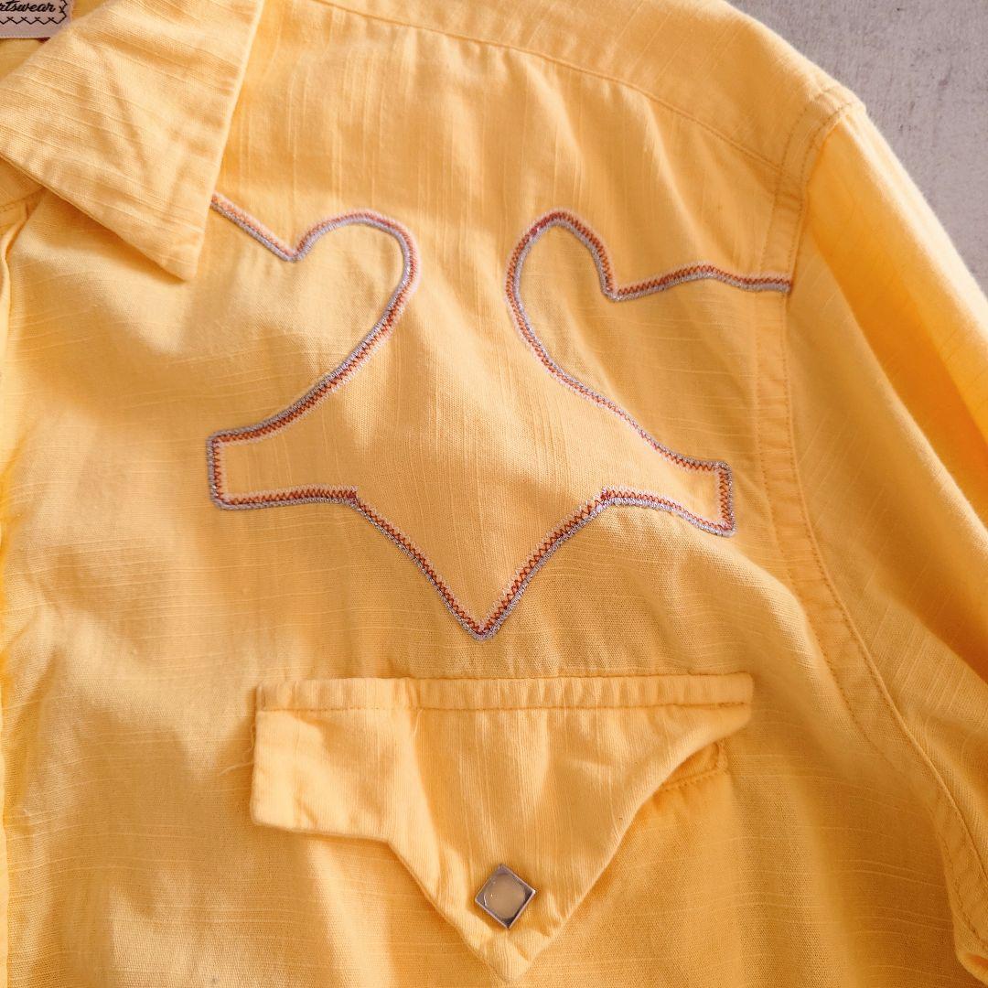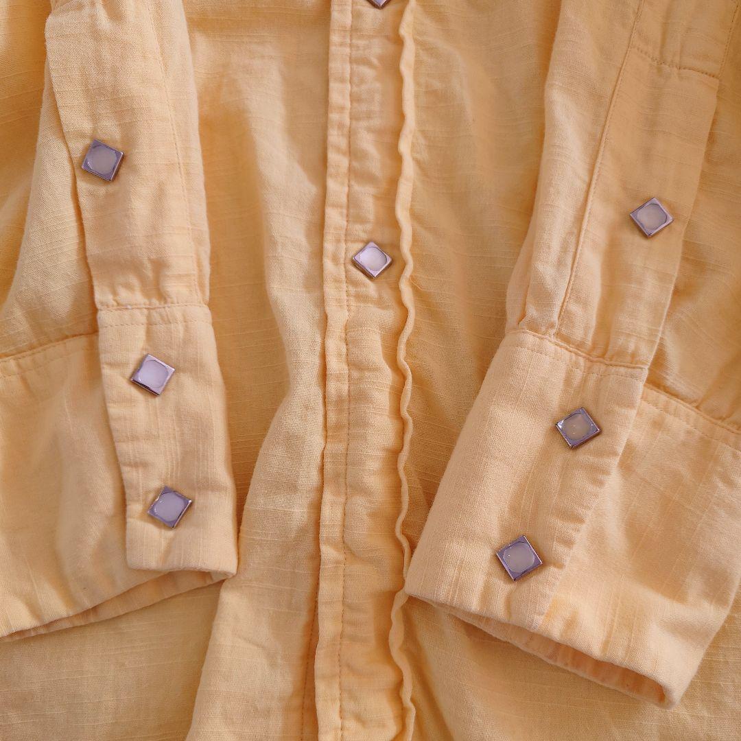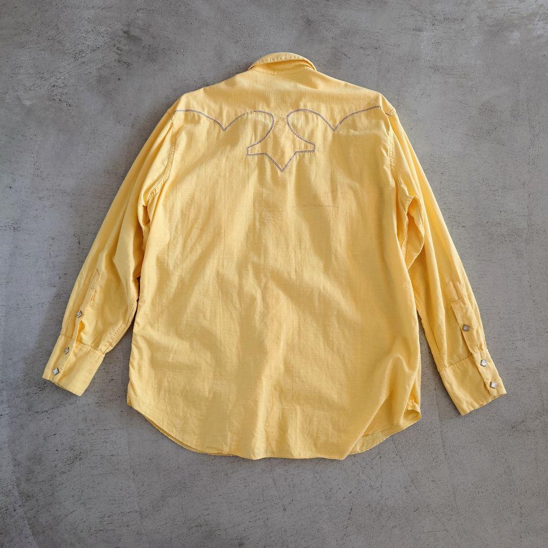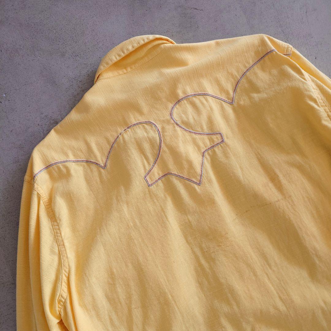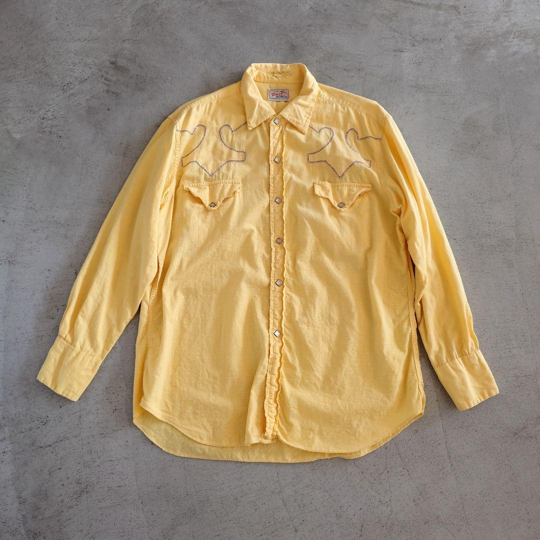 ■商品名Tem-Tex ウエスタンシャツ ■色イエロー ■サイズ16~161/2 ■肩幅 49 cm ■身幅58 cm ■着丈 78 cm ■袖丈 59 cm ■素材 コットン100 % ●商品説明 アメリカのウエスタンシャツメーカー Tem-Texの60年代のシャツになります。 こちらのブランドはウエスタンシャツにしては 珍しくウエストの絞りがなく通常のシャツのような シルエットで細くなりすぎず着やすい形です。 SPORTSWEARの刻印からファッションラインとして シルエットなど見直されて生産された商品では ないかと推測されます。 背中に汚れがございますので写真にてご確認ください。 スナップボタンすべてオリジナルで不良なしで 状態もいいです。