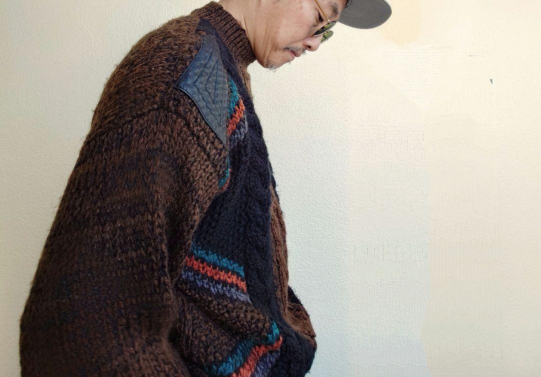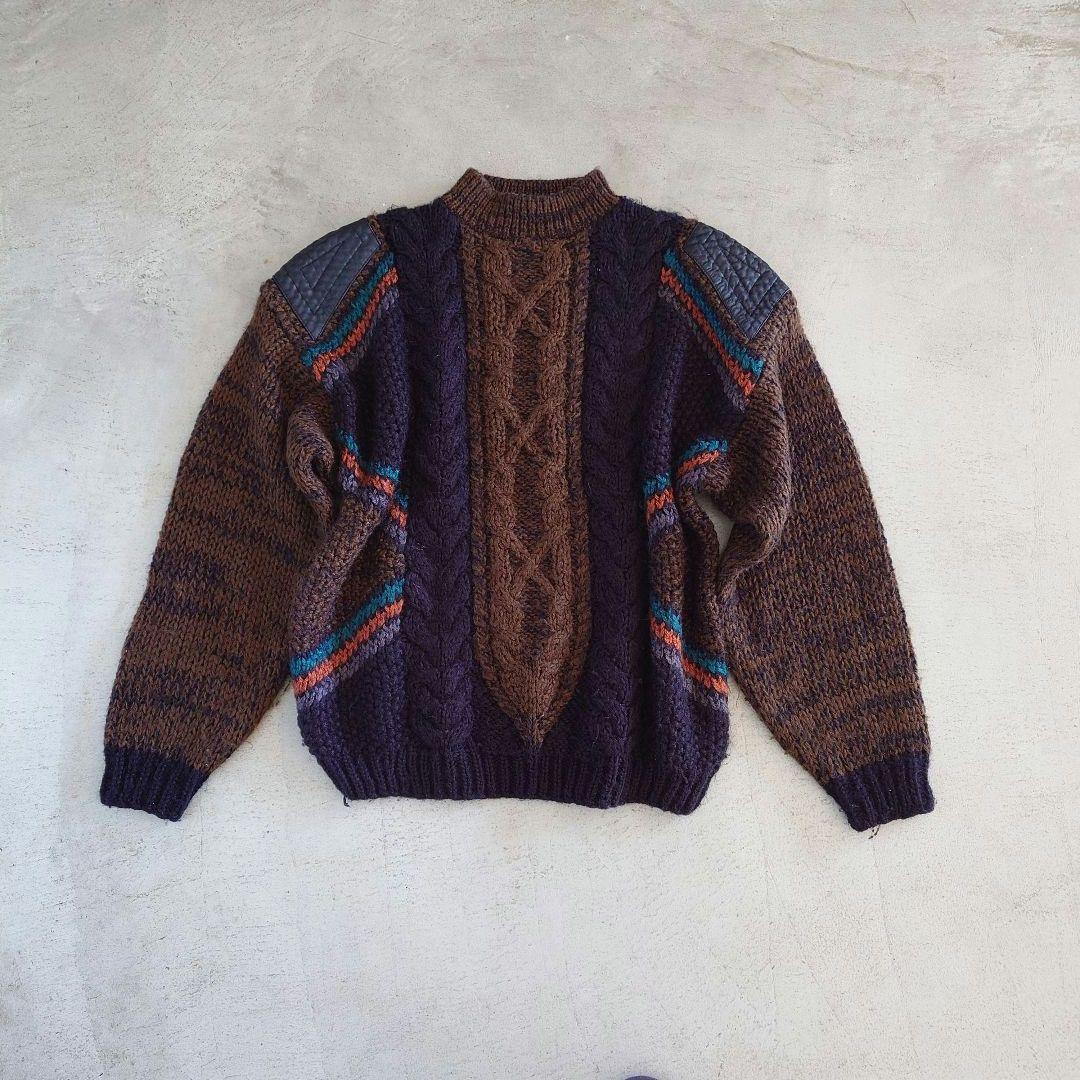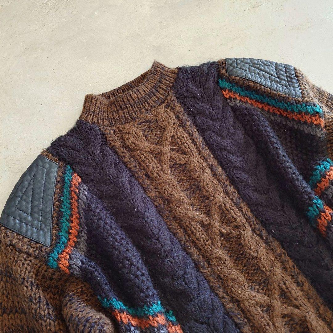 Used Leather Patch Knit 古着 ユーズド レザーパッチ デザイン ニット セーター L相当