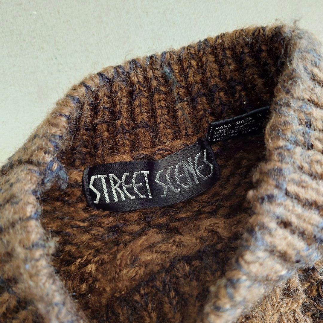■商品名street scenes ■色 ブラウン ■サイズL ■肩幅 59 cm ■身幅 59cm ■着丈67 cm ■袖丈56 cm ■素材 アクリルウール100 レザー モデル178cm ●商品説明 レザーの肩パッチがつけられ古いものとは思えないデザインのいいニットです。 きれいな切り返しの色も雰囲気がいいです。 背中は無地になるのできやすいデザインです。 使用感ありますが目立つダメージなどはございません。 古着のため味としてご理解いただきご検討ください。