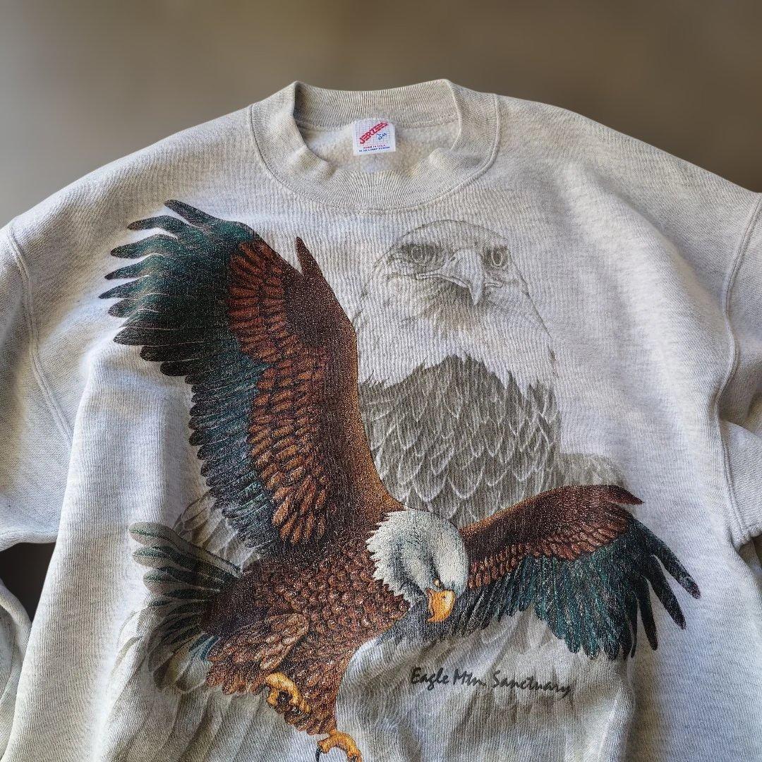 ■商品名ユーズド ■色グレー ■サイズL ■肩幅 54 cm ■身幅 54 cm脇下採寸 ■着丈 61cm首下より採寸 ■袖丈 53cm ■素材 コットン ポリ ●商品説明 イーグルのグラフィックが いい雰囲気のスウェット ライトオンスでインナーにも つかいやすい厚みです。 目立つダメージなどございません。、