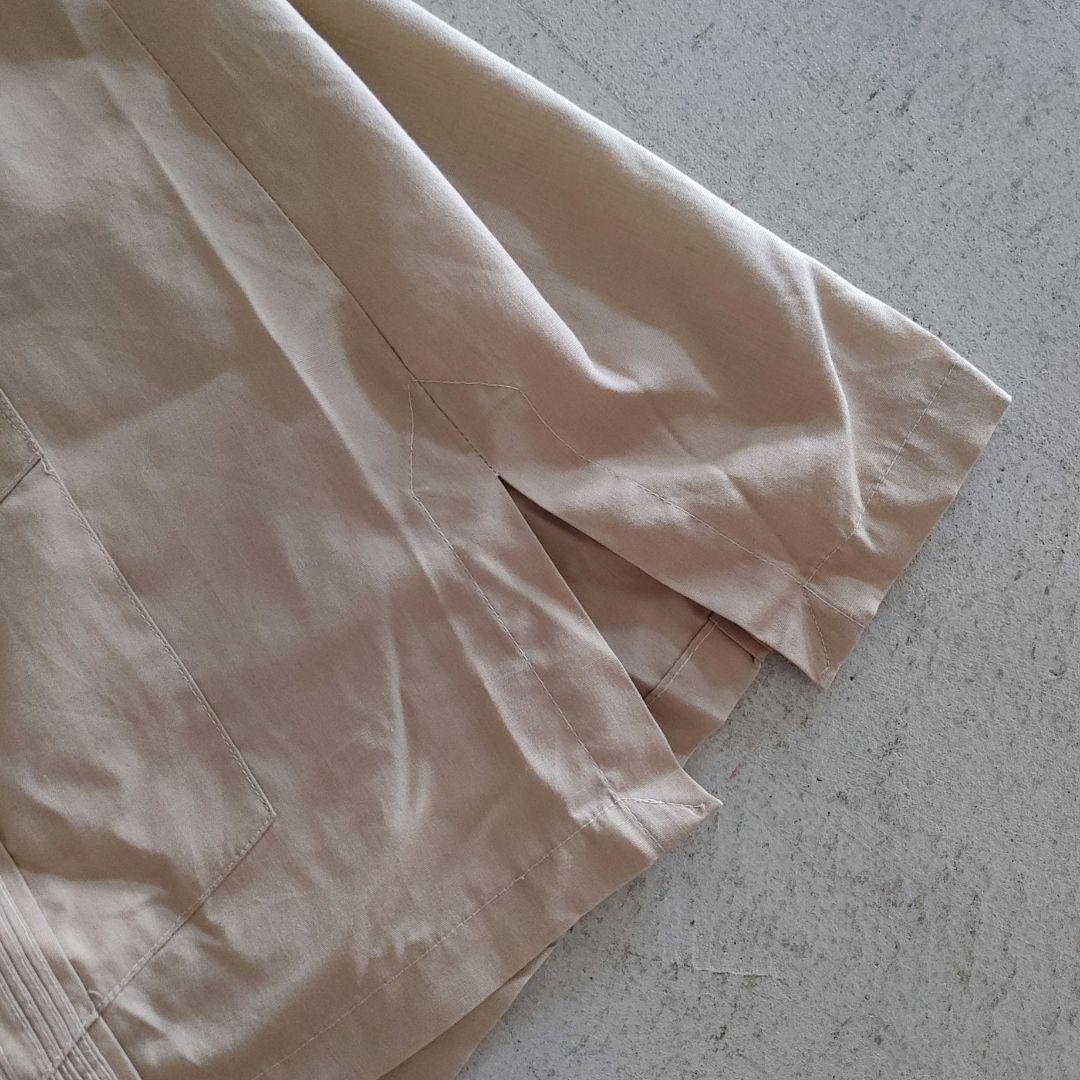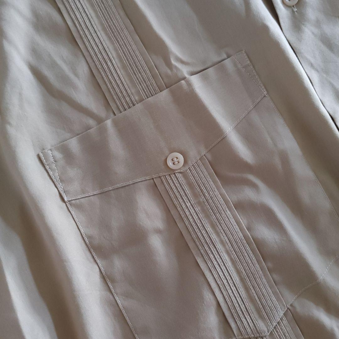 ■商品名van heusen ■色カーキ ■サイズL ■肩幅 48 cm ■身幅 52cm ■着丈 74 cm ■袖丈 24 cm ■素材 コットン 65 ポリ35 ●商品説明 VAN HEUSENのサファリシャツ デザイナーブランドらしく本来の土臭いアイテムを きれいにまとめております。 さらっとした光沢のある上質な生地感 と襟のきれいなロール感など デザインはメキシカンシャツですが トラッドなこなしがされています。 サイドスリットもさらりとシンプルなつくり デッドストックできれいなお品です。